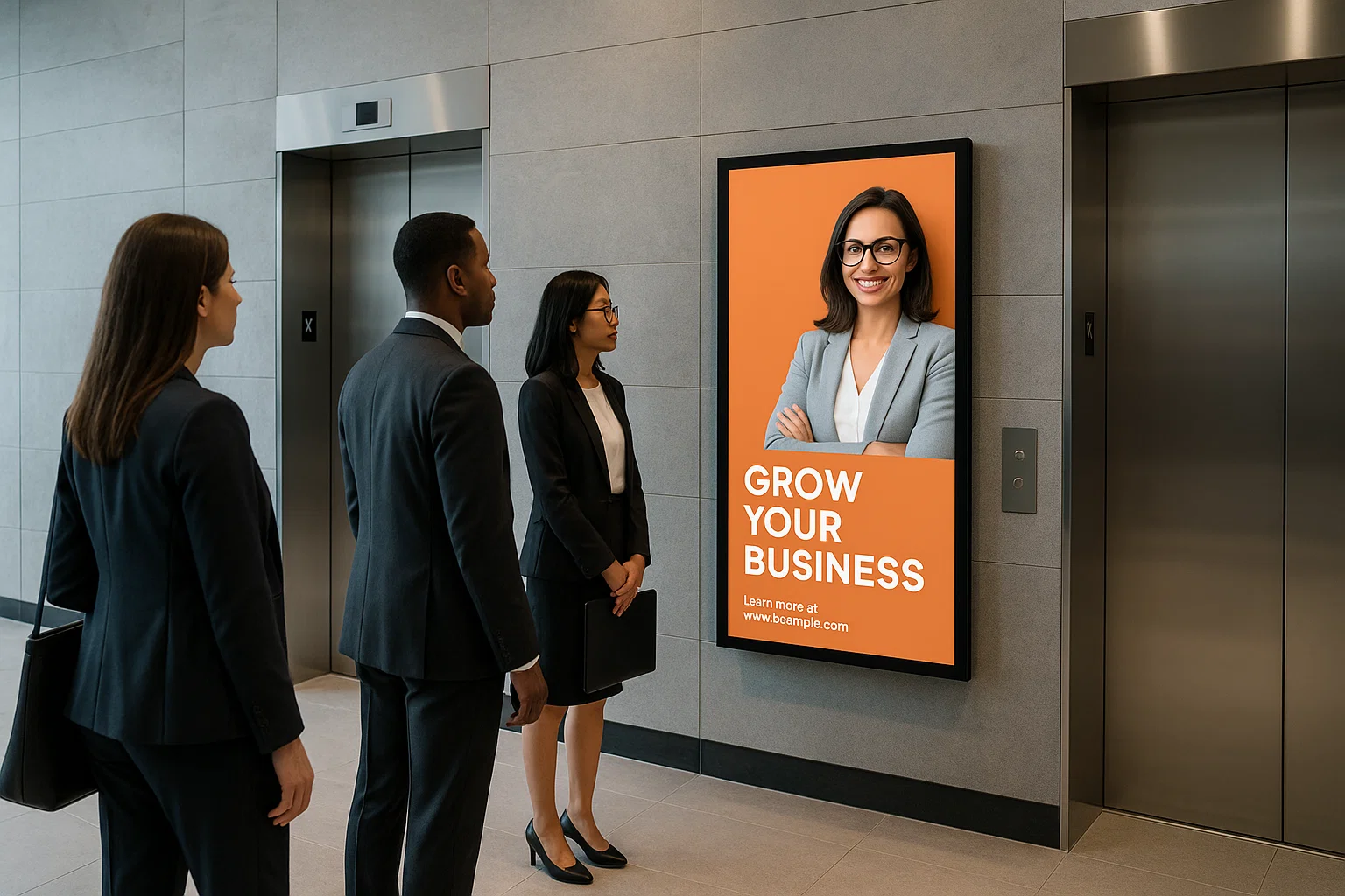 Targeted elevator screens in offices engage professionals with precise brand communication.