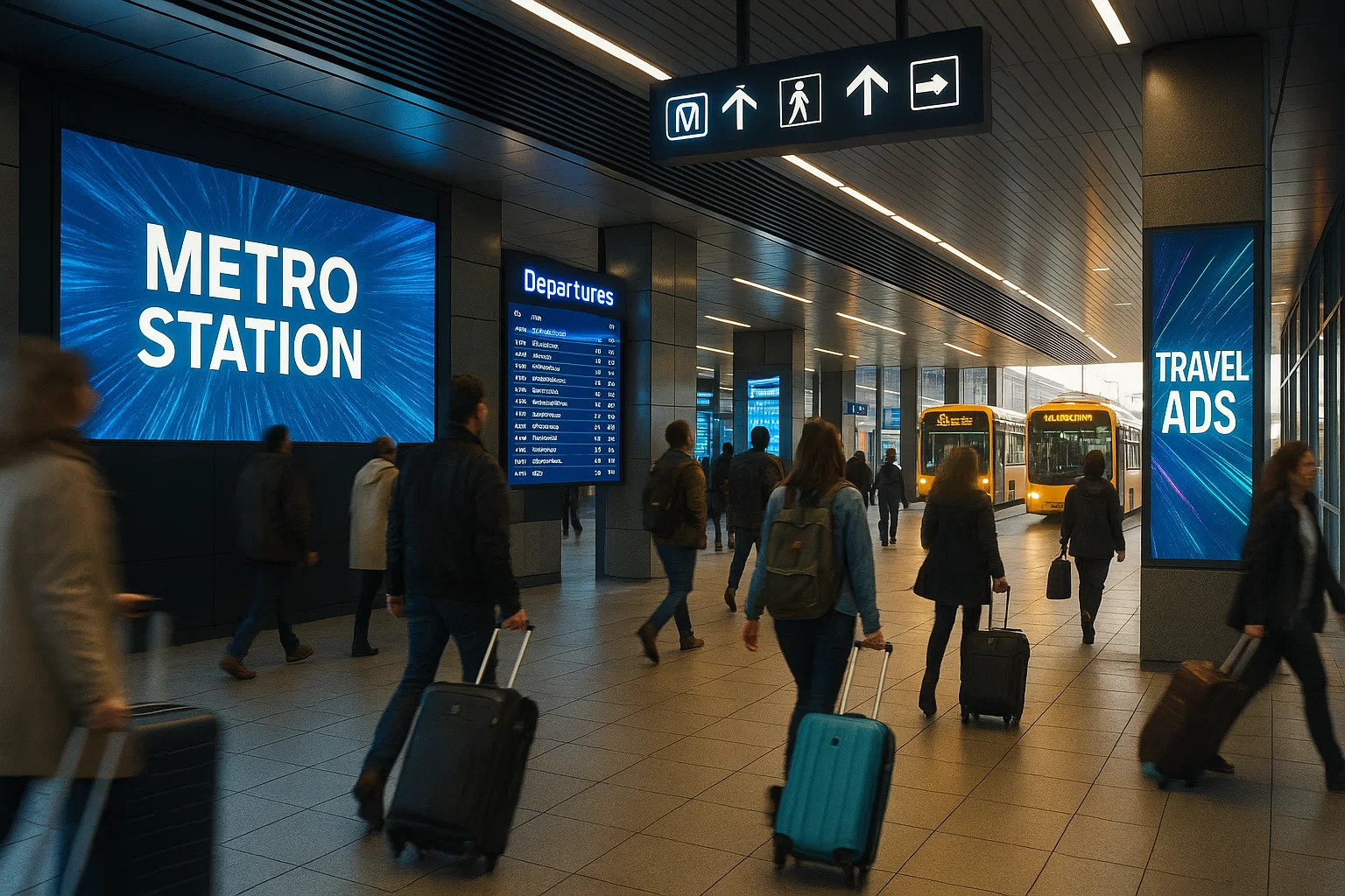 Ads on buses, metros, and airports capture attention of commuters during daily journeys.